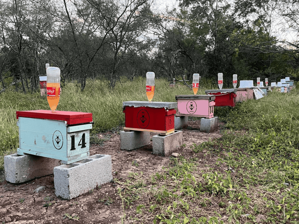Colmenas en crecimiento con un dispensador endulzante para su alimentación en época de frio. Créditos: Alan Elí.